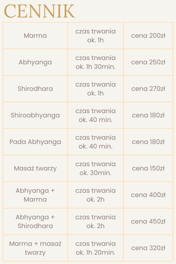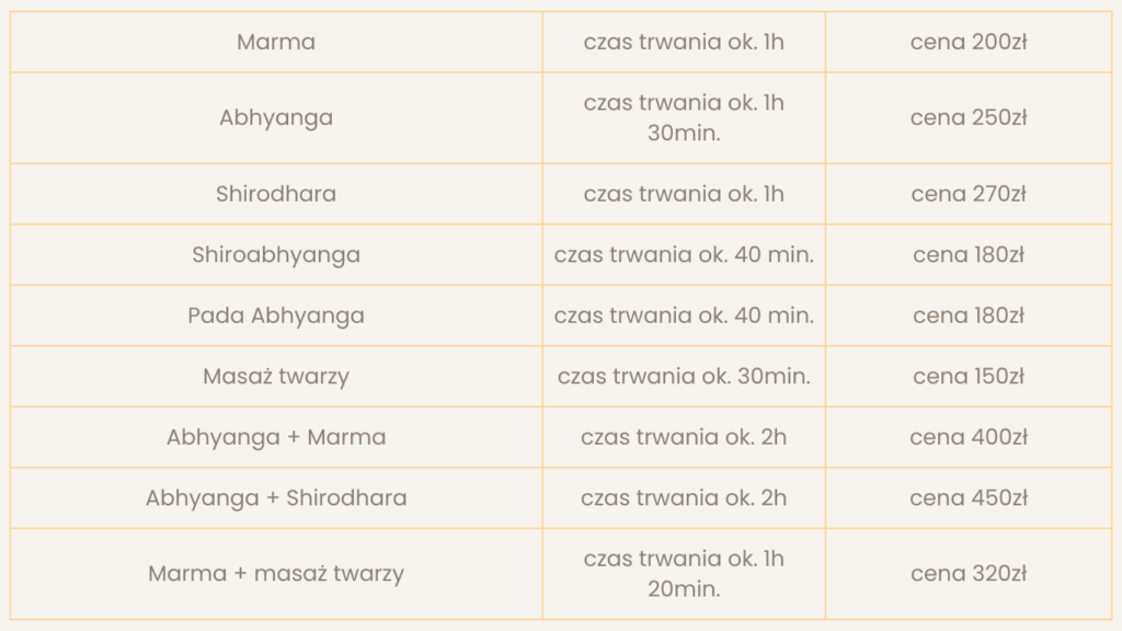 Abhyanga – Abhyanga to masaż całego ciała z użyciem oleju. Poprawia krążenie i głęboko relaksuje. Przywraca w ciele równowagę energetyczną i łagodzi stres. Rewitalizuje i odżywia skórę, poprawiając jej kondycję. Oczyszcza cały organizm i pozwala mu się regenerować.